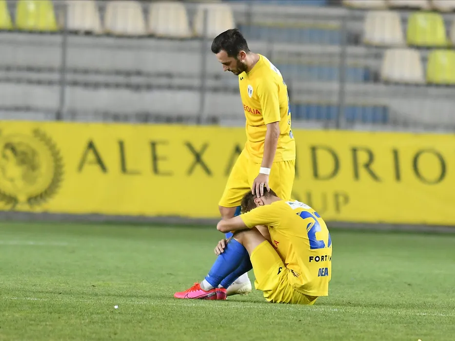 Stefan Nicolae Barboianu il consoleaza pe Gabriel Deac dupa meciul de fotbal dintre Petrolul Ploiesti si FC Arges, contand pentru play-off-ul de promovare a Ligii a-2-a Casa Pariurilor, disputat fara spectatori pe Stadionul Ilie Oana din Ploiesti, marti 28 iulie 2020. © FOTO:Razvan Pasarica/SPORT PICTURES