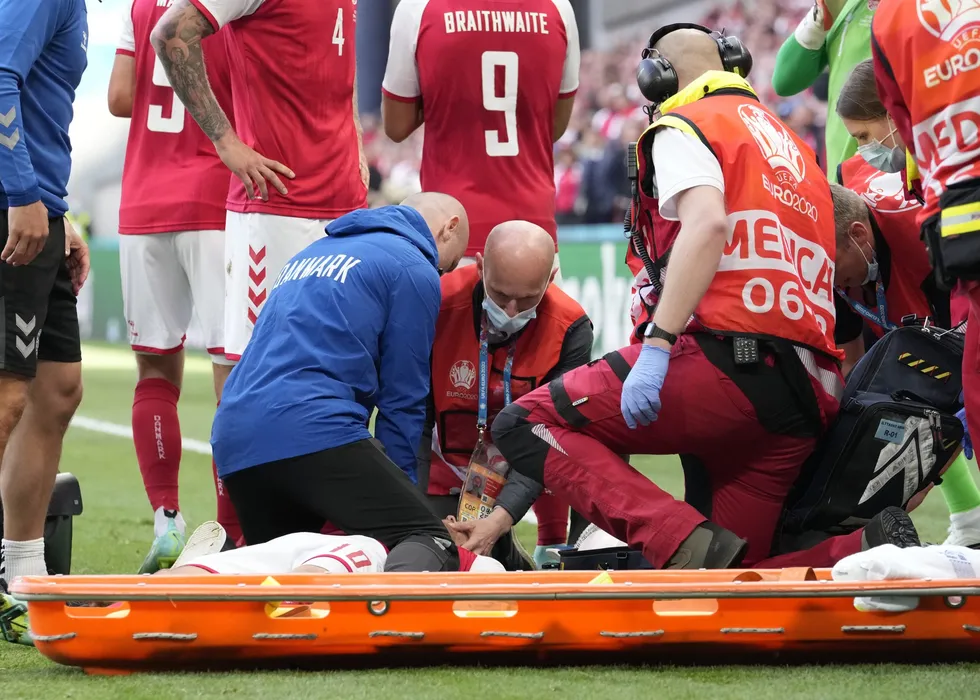 Denmark's Christian Eriksen receives medical treatment after collapsing during the Euro 2020 soccer championship group B match between Denmark and Finland at Parken stadium in Copenhagen, Saturday, June 12, 2021. (AP Photo/Martin Meissner, Pool)