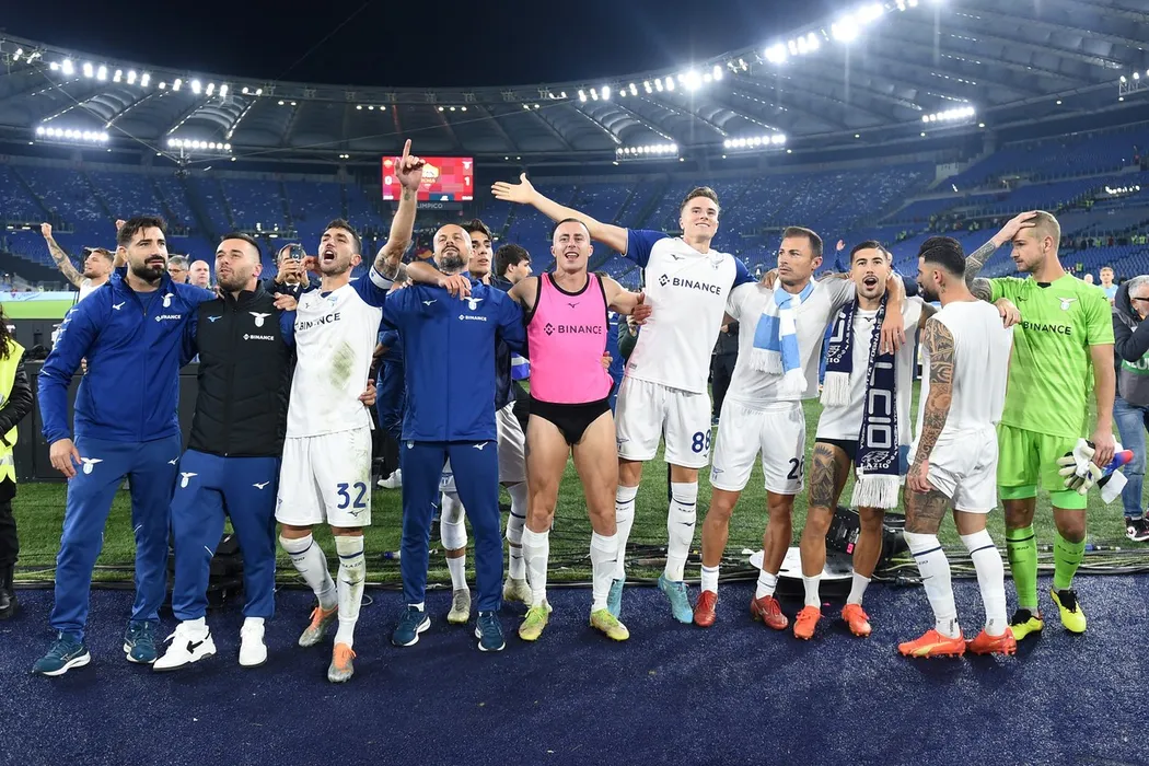 The Lazio players celebrating the victory at the end of the match during the match Roma v Lazio at the Stadio Olimpico. Rome (Italy), November 06th, 2022,Image: 735756396, License: Rights-managed, Restrictions: * Italy Rights OUT *, Model Release: no