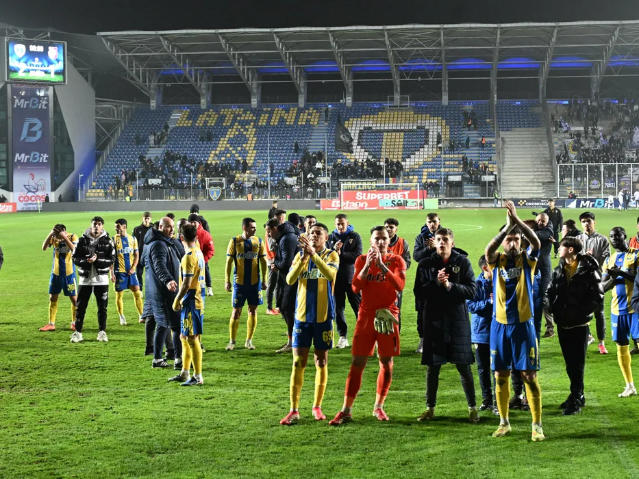 Fotbalistii ploiesteni printre care Valentin Gheorghe, Hermann Rafael Baldres, Cedric Benjamin Roche Yohan, Andrei Raul Balbarau, Stefan Alexandru Radulescu si Paul Papp saluta galeria dupa meciul de fotbal dintre Petrolul Ploiesti si FC Arges, contand pentru Superliga Superbet, desfasurat pe Stadionul Ilie Oana din Ploiesti, vineri 13 februarie 2026. © FOTO:Razvan Pasarica/SPORT PICTURES