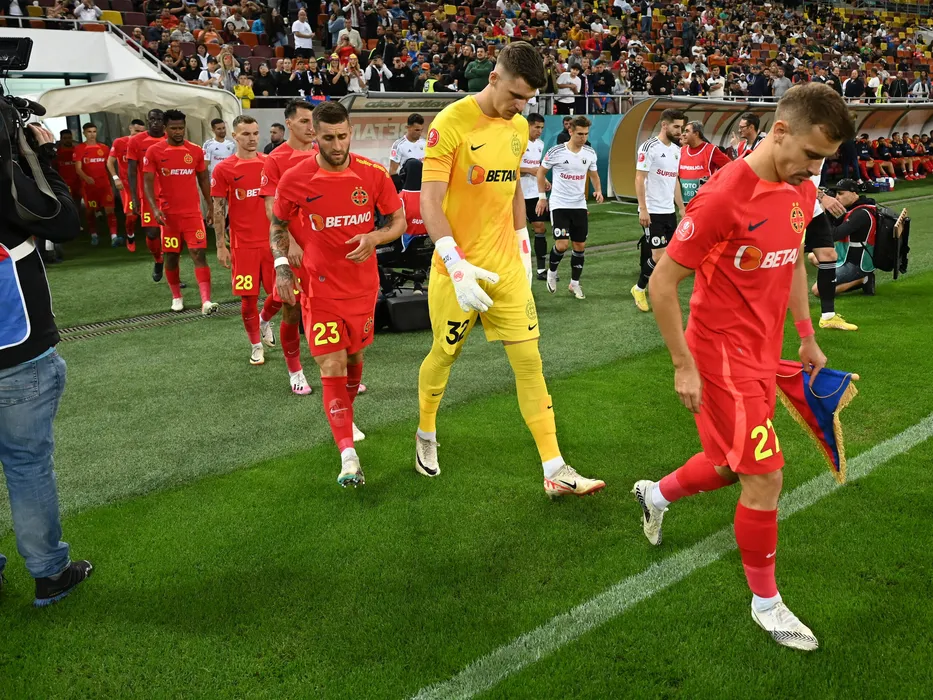 Fotbalistii stelisti Siyabonga Ngezana, Grigoras Alexandru Pantea, Risto Radunovic, Ovidiu Marian Popescu, Stefan Tarnovanu si Darius Dumitru Olaru la startul meciului de fotbal dintre FCSB si Universitatea Cluj, din cadrul Superligii Superbet, desfasurat pe Arena Nationala din Bucuresti, luni 2 octombrie 2023. © FOTO:Razvan Pasarica/SPORT PICTURES
