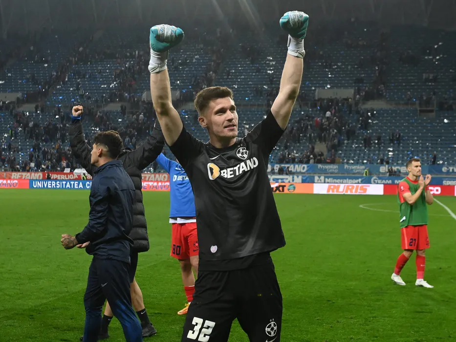 Stefan Tarnovanu se bucura alaturi de galerie dupa meciul de fotbal dintre Universitatea Craiova si FCSB, contand pentru Play-off-ul Superligii Superbet, desfasurat pe Stadionul Ion Oblemenco din Craiova, duminica 30 aprilie 2023. © FOTO:Razvan Pasarica/SPORT PICTURES