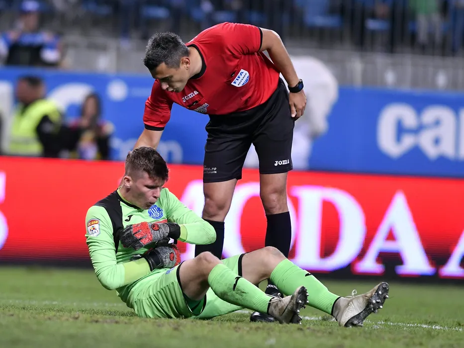Arbitrul central Horatiu Fesnic si portarul iesean Stefan Tarnovanu in meciul de fotbal dintre Universitatea Craiova si CSM Politehnica Iasi, din cadrul Ligii 1 Casa Pariurilor, desfasurat pe Stadionul Ion Oblemenco din Craiova, vineri 4 octombrie 2019. © FOTO:Razvan Pasarica/SPORT PICTURES