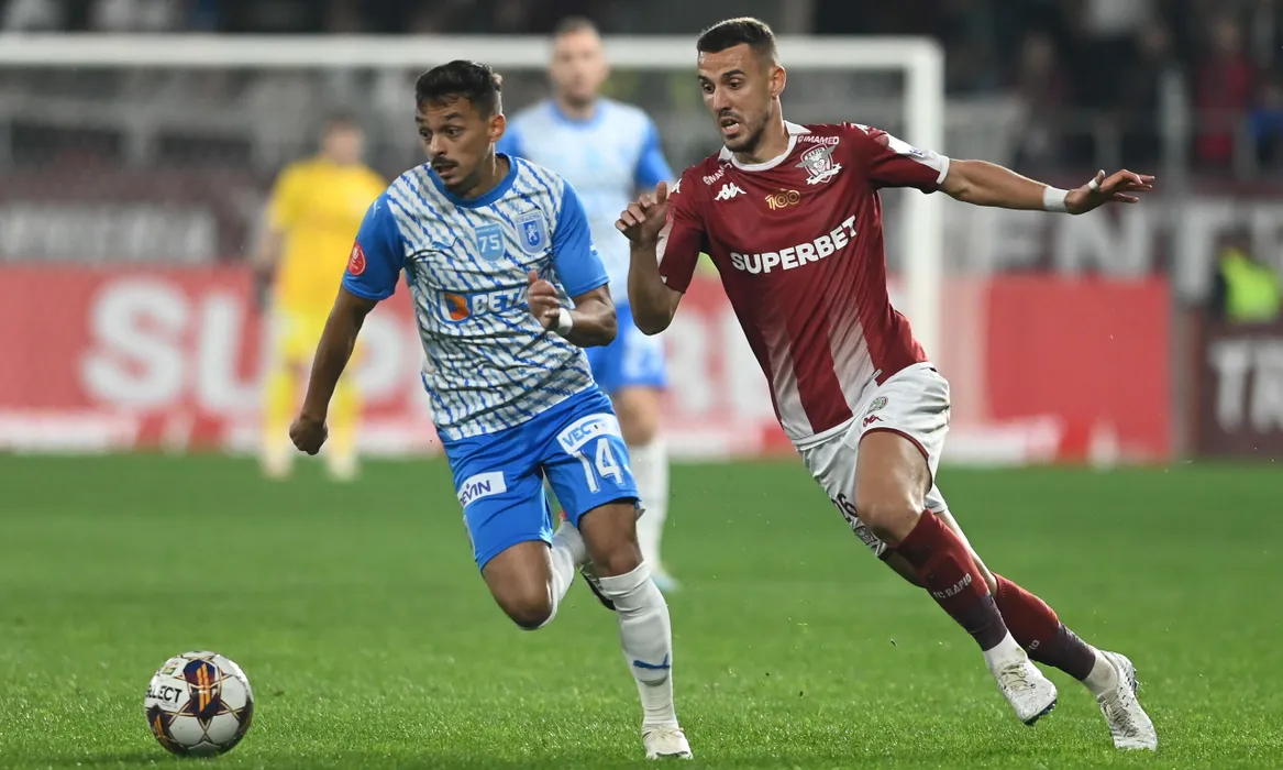 Lyes Hafid Houri si Razvan Constantin Oaida in meciul de fotbal dintre Rapid Bucuresti si Universitatea Craiova, din cadrul Superligii Superbet, desfasurat pe Superbet Arena-Giulesti din Bucuresti, duminica 29 octombrie 2023. © FOTO:Razvan Pasarica/SPORT PICTURES