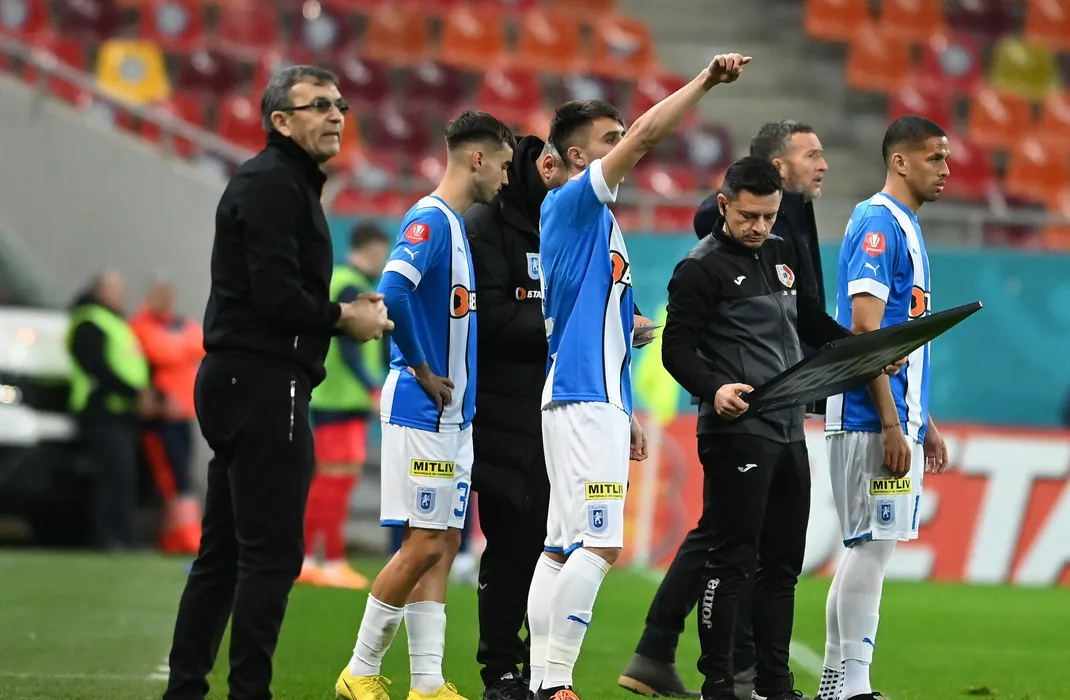 Arbitrul de rezerva Iulian Dima alaturi de fotbalistii craioveni David Sala, Stefan Marinel Vladoiu si Vitor Ferreira Mosac Rivaldo la schimbare la meciul de fotbal dintre FCSB si Universitatea Craiova, contand pentru Superliga Superbet, desfasurat pe Arena Nationala din Bucuresti, duminica 19 februarie 2023. © FOTO:Razvan Pasarica/SPORT PICTURES