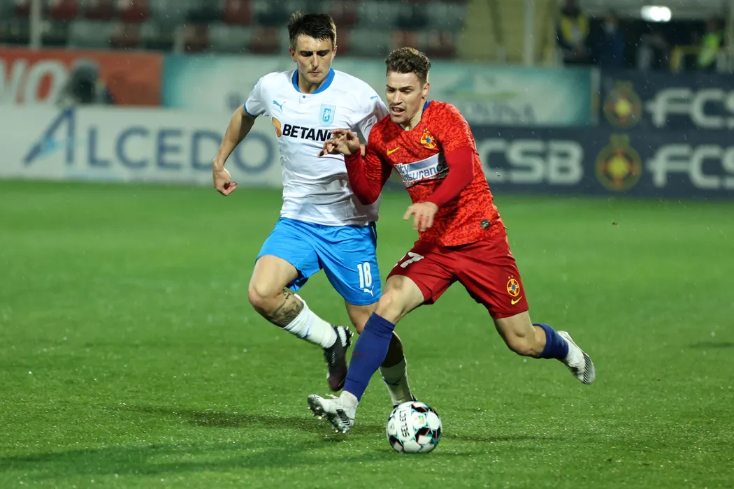 Darius Olaru (D), de la FCSB, lupta pentru balon cu Stefan Vladoiu (S), de la Universitatea Craiova, in meciul de fotbal din etapa 29 a Ligii 1, disputat pe stadionul Marin Anastasovici din Giurgiu, duminica, 4 aprilie 2021. GEORGE FILIP / MEDIAFAX FOTO