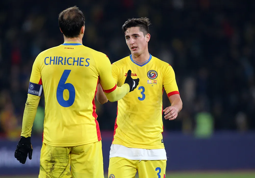 Vlad Chiriches (S) si Steliano Filip (D),de la nationala Romaniei, reactioneaza la finalul meciului de fotbal contra selectionatei Spaniei, in timpul amicalului disputat pe stadionul Cluj Arena din Cluj-Napoca, duminica, 27 martie 2016. SEBASTIAN TATARU / MEDIAFAX FOTO