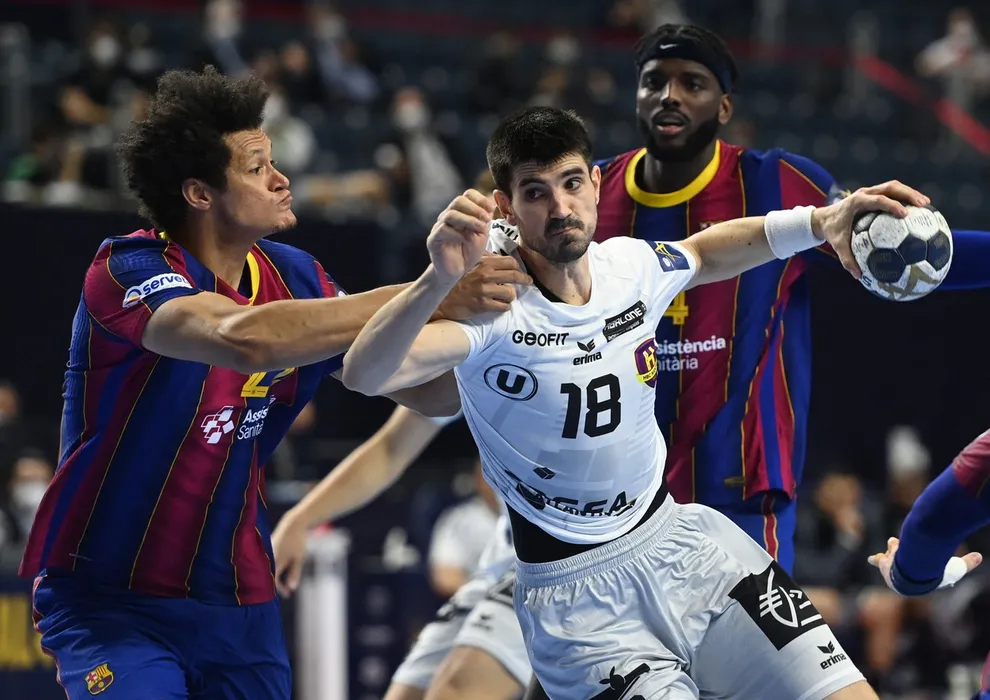 Barcelona's Brazilian line player Thiagus Petrus Goncalves dos Santos (L) and Nantes' Spanish right back Eduardo Gurbindo Martinez vie for the ball during the EHF Men's Champions League Final Four semi-final handball match between FC Barcelona Handbol (ESP) and HBC Nantes (FRA) in Cologne, western Germany, on June 12, 2021.,Image: 615416022, License: Rights-managed, Restrictions: , Model Release: no, Credit line: Profimedia