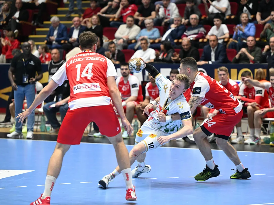 Gisli Thorgeir Kristjansson si Robert Mihai Militaru in meciul de handbal masculin dintre Dinamo Bucuresti si SC Magdeburg, din cadrul EHF Champions League, desfasurat in Sala Polivalenta-Ioan Kunst Ghermanescu din Bucuresti, miercuri 26 martie 2025. © FOTO:Razvan Pasarica/SPORT PICTURES