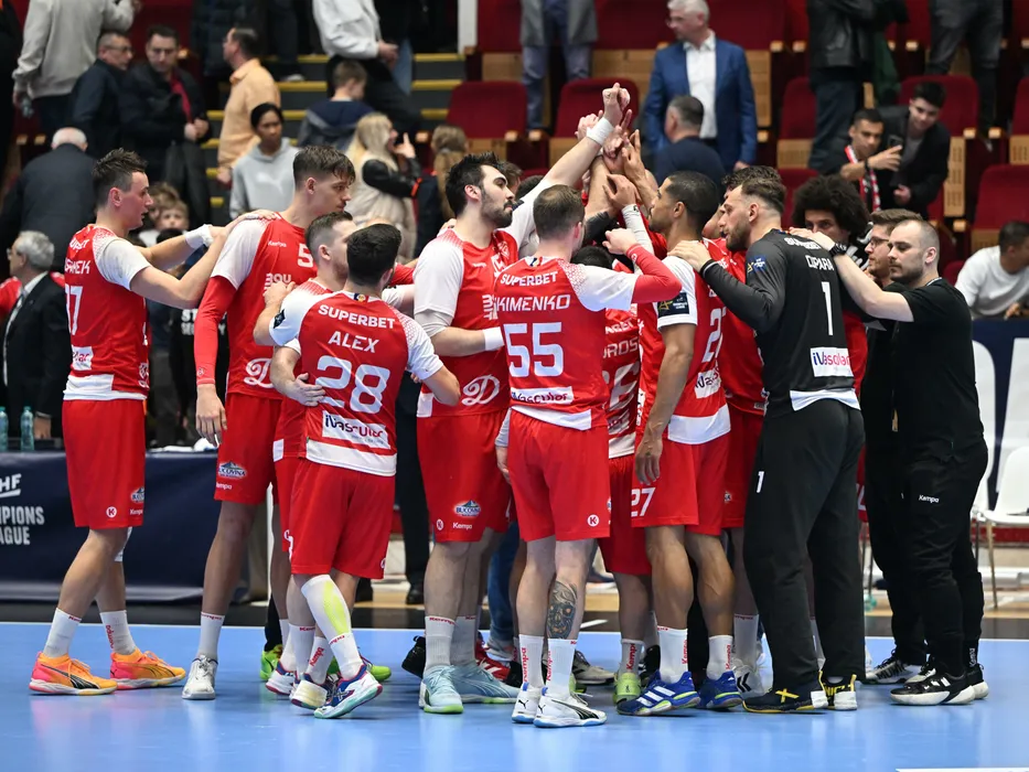 Handbalistii dinamovisti printre care Stanislav Kasparek, Calin Dedu, Andre Gomes Dias Lopes si Vladimir Cupara se incurajeaza dupa meciul de handbal masculin dintre Dinamo Bucuresti si SC Magdeburg, din cadrul EHF Champions League, desfasurat in Sala Polivalenta-Ioan Kunst Ghermanescu din Bucuresti, miercuri 26 martie 2025. © FOTO:Razvan Pasarica/SPORT PICTURES