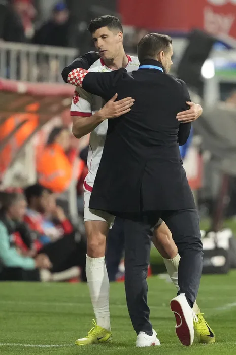Stipe Perica incurajat de Zeljko Kopic dupa schimbare in meciul de fotbal dintre UTA Arad si Dinamo Bucuresti, contand pentru Superliga Superbet, desfasurat pe Arena Francisc Neuman din Arad, luni 10 martie 2025. © FOTO: Alexandra Fechete/SPORT PICTURES