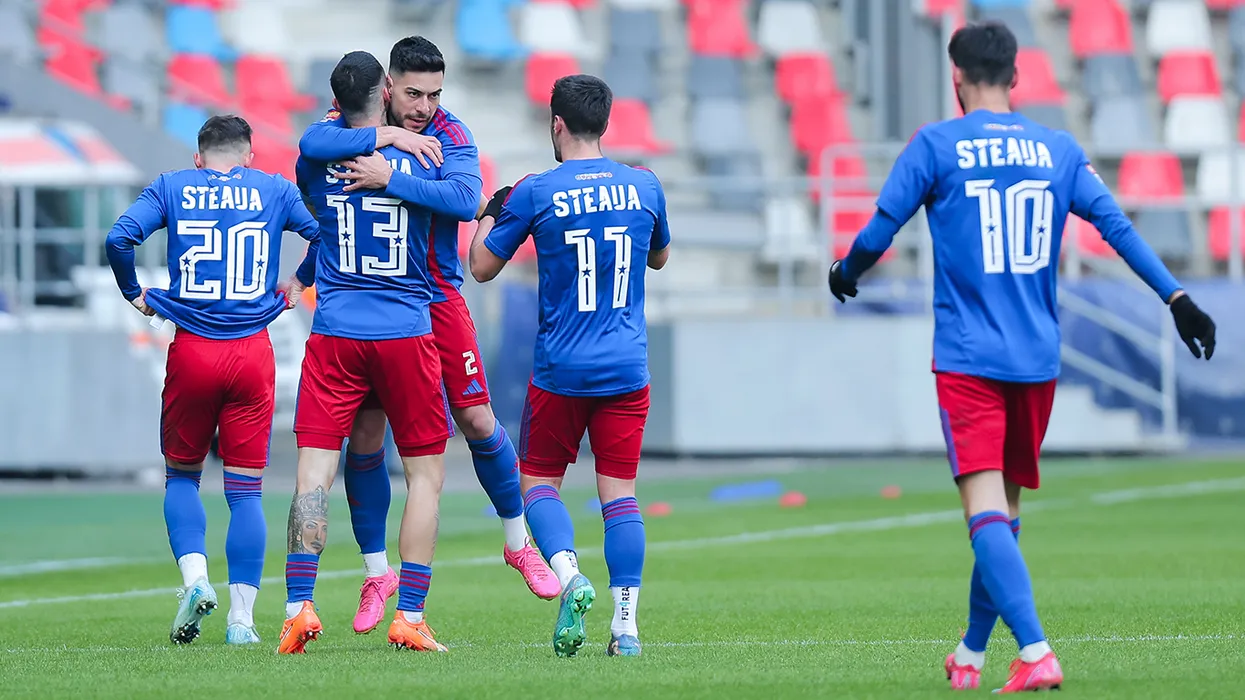 Ionut Gabriel Nedelea felicitat de colegi dupa un gol marcat in meciul de fotbal dintre Steaua Bucuresti si FC Voluntari, contand pentru Liga 2 Casa Pariurilor, desfasurat pe Stadionul Steaua din Bucuresti, sambata 22 februarie 2025. © FOTO: Mihai-Antonio Vasile/SPORT PICTURES