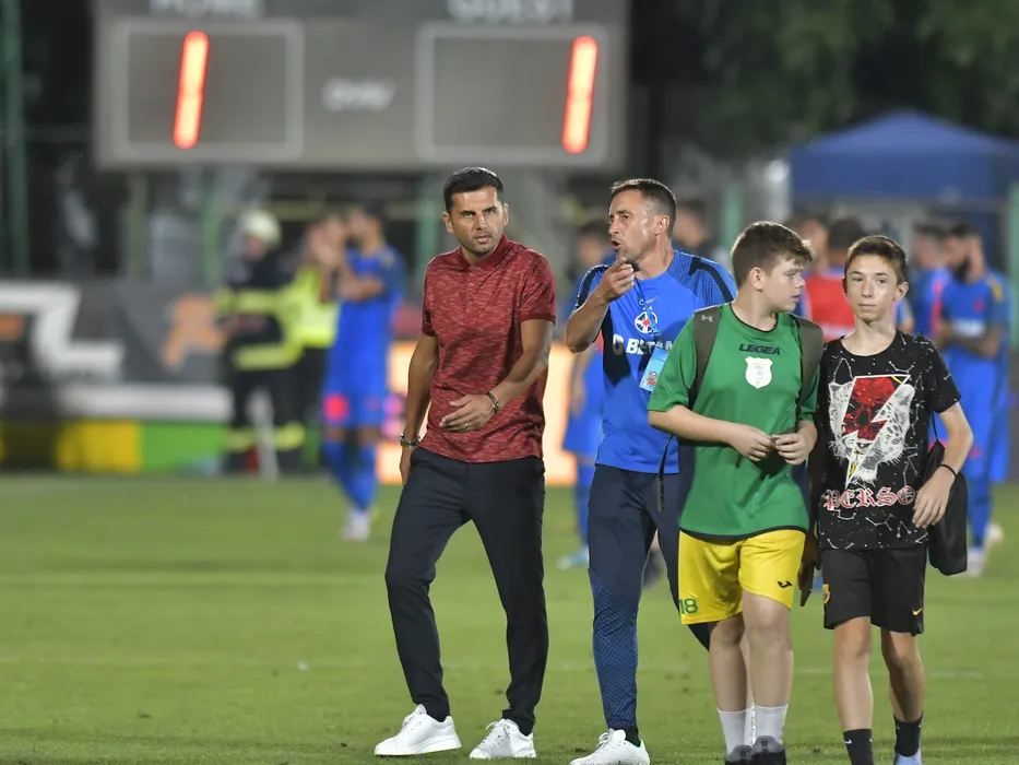 Nicolae Dica si Viorel Tanase discuta dupa meciul de fotbal dintre CS Mioveni si FCSB, contand pentru Superliga Superbet, desfasurat pe Stadionul Orasenesc din Mioveni, sambata 6 august 2022. © FOTO:Razvan Pasarica/SPORT PICTURES