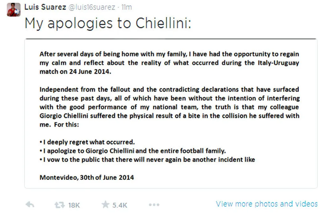 Suarez a recunoscut că l-a mușcat pe Chiellini: „Îmi cer scuze lui Giorgio și tuturor iubitorilor fotbalului”. Replica italianului