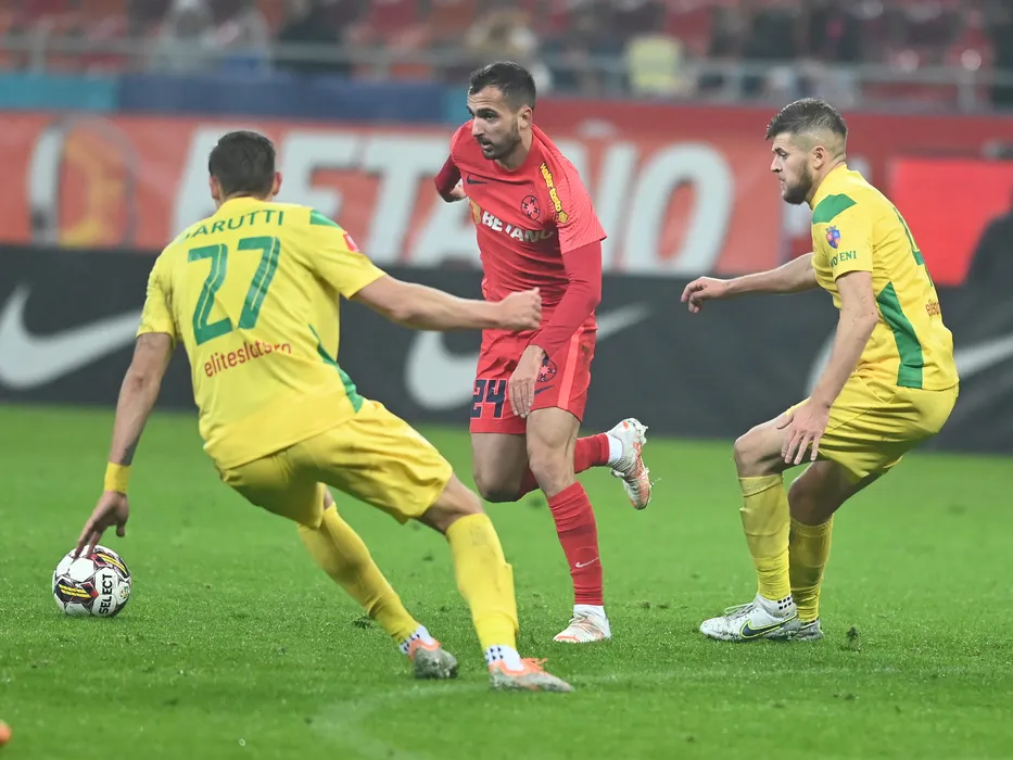Boban Nikolov si Cornel Alexandru Ene in meciul de fotbal dintre FCSB si CS Mioveni, contand pentru Superliga Superbet, desfasurat pe Arena Nationala din Bucuresti, luni 5 decembrie 2022. © FOTO:Razvan Pasarica/SPORT PICTURES