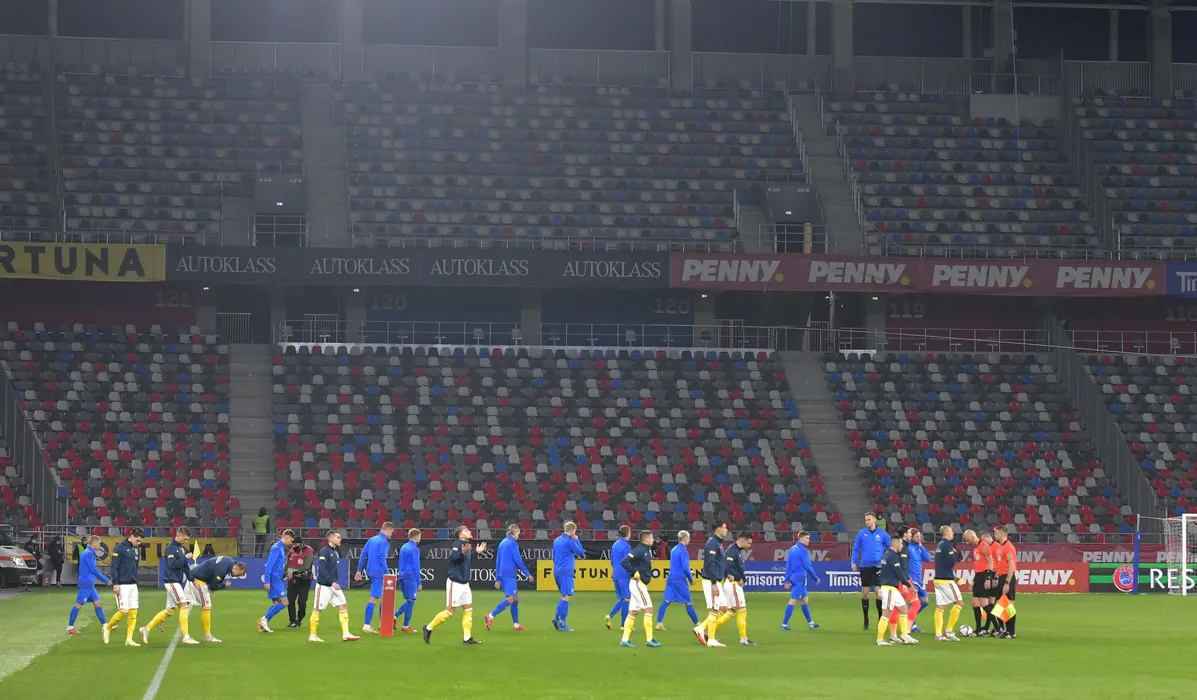 Fotbalistii celor doua echipe la startul meciului de fotbal dintre Romania si Islanda, din cadrul Preliminariilor Campionatului Mondial 2022, desfasurat pe Stadionul Steaua din Bucuresti, joi 11 noiembrie 2021. © FOTO:Razvan Pasarica/SPORT PICTURES