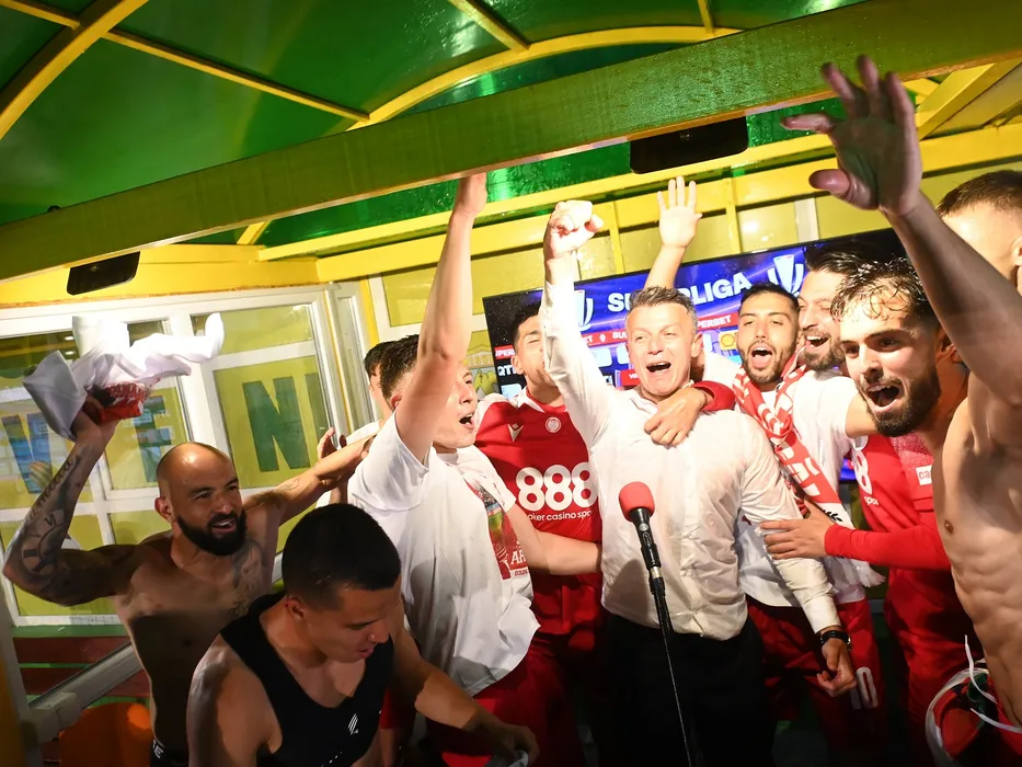 Fotbalistii dinamovisti Gabriel Rodrigues De Moura, Deniz Giafer, Daniel Gago Iglesias, Catalin Tira si Daniel Gago Iglesias alaturi de Ovidiu Burca se bucura dupa promovarea in prima liga a echipei favorite in urma meciului de fotbal dintre FC Arges si Dinamo Bucuresti, contand pentru mansa retur a Barajului pentru mentinerea in Superliga Superbet, desfasurat pe Stadionul Orasenesc din Mioveni, sambata 3 iunie 2023. © FOTO:Razvan Pasarica/SPORT PICTURES