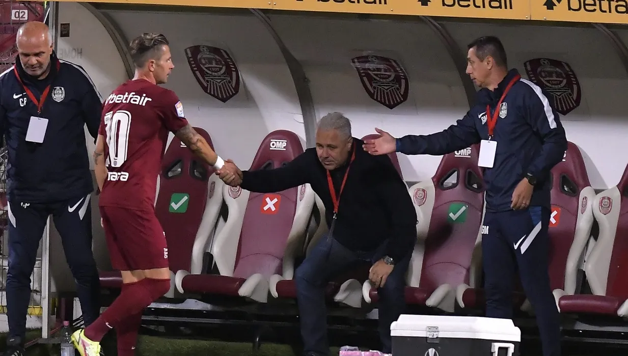 Cristian Panin, Marius Sumudica si Gabriel Margarit il saluta pe Ciprian Ioan Deac la iesirea din teren la meciul de fotbal dintre CFR Cluj si Steaua Rosie Belgrad, contand pentru Play-off-ul UEFA Europa League, desfasurat pe Stadionul Dr. Constantin Radulescu din Cluj Napoca, joi 26 august 2021. © FOTO:Razvan Pasarica/SPORT PICTURES