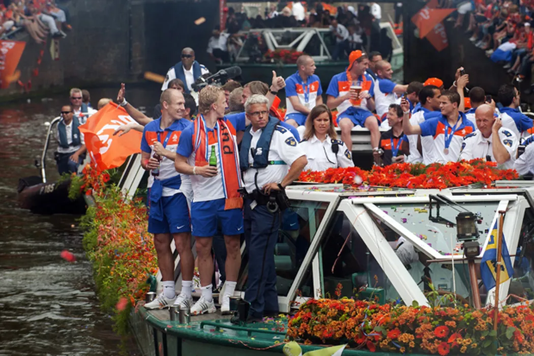 SUPER FOTO** Primire de gală pentru eroii Olandei! Sneijder și compania au defilat pe canalele din Amsterdam