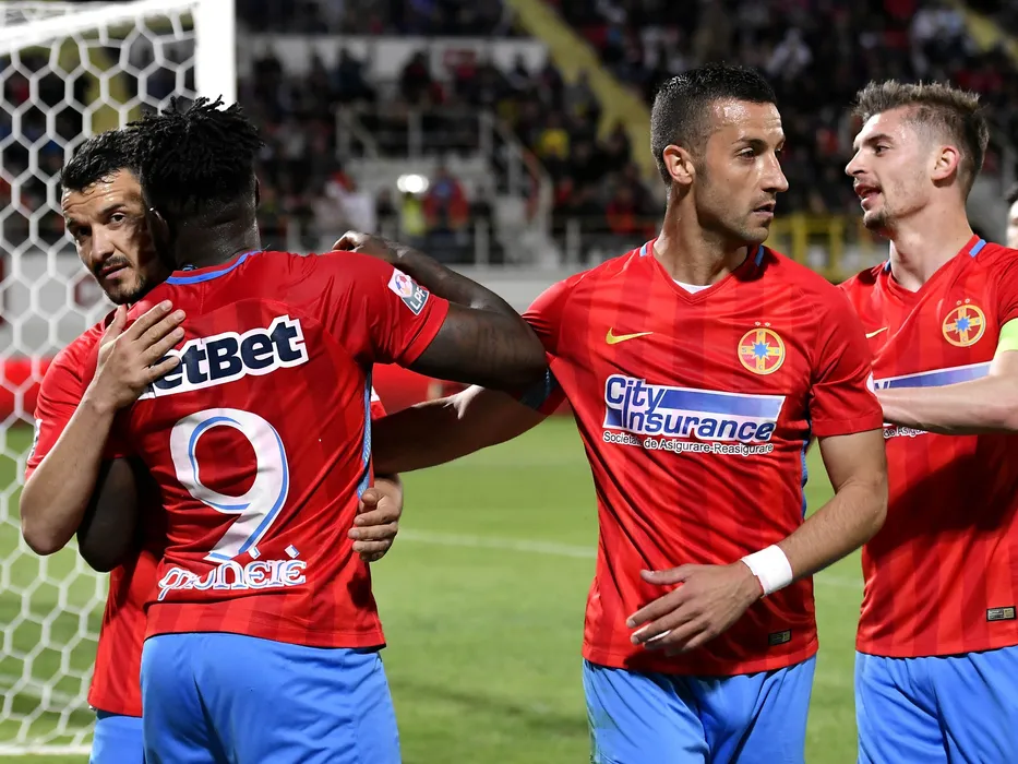 Bucurie stelista cu Constantin Budescu,Harlem Gnohere,Marko Momcilovic si Florin Tanase in meciul de fotbal dintre Astra Giurgiu si FC Steaua Bucuresti, din cadrul play off-ului Ligii 1 Betano, desfasurat pe Stadionul Marin Anastasovici din Giurgiu, luni 16 aprilie 2018. © FOTO Razvan Pasarica/SPORT PICTURES