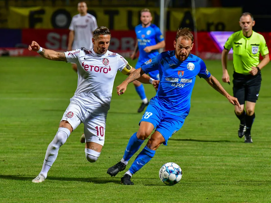 Ciprian Deac si Juan Bautista Cascini in meciul de fotbal dintre Academica Clinceni si CFR Cluj, contand pentru Liga 1 Casa Pariurilor, desfasurat pe Stadionul Municipal-Ion Comsa din Calarasi, sambata 24 iulie 2021. © FOTO:George Ionescu/SPORT PICTURES