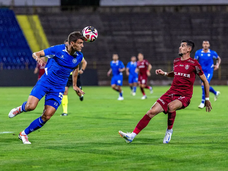 Plamen Galabov și Meriton Korenica în meciul de fotbal dintre FC Maccabi Petah Tikva și FC CFR 1907 Cluj, contând pentru turul al treilea preliminar Conference League, desfășurat pe Stadionul Georgi Asparuhov din Sofia, joi 8 august 2024. © FOTO: Horvath TAMAS/SPORT PICTURES