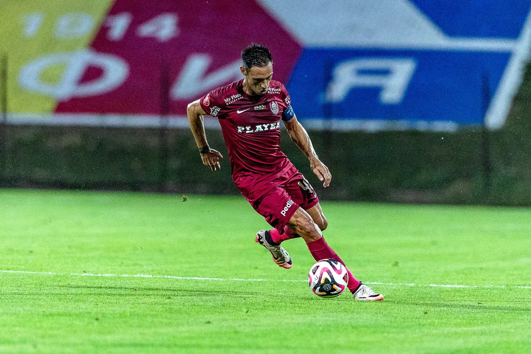 Mario Camora (Malico Paulino Mario Jorge) în meciul de fotbal dintre FC Maccabi Petah Tikva și FC CFR 1907 Cluj, contând pentru turul al treilea preliminar Conference League, desfășurat pe Stadionul Georgi Asparuhov din Sofia, joi 8 august 2024. © FOTO: Horvath TAMAS/SPORT PICTURES