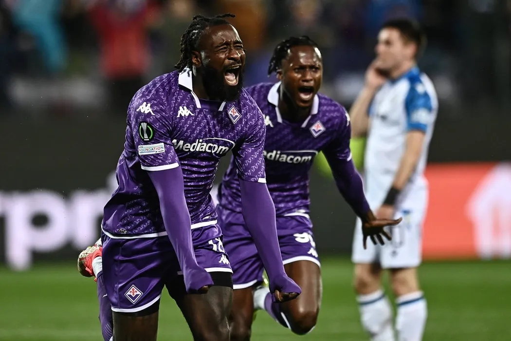 Mp Firenze 02/05/2024 - Conference League / Fiorentina-Club Brugge / foto Matteo Papini/Image nella foto: esultanza gol Mbala Nzola,Image: 869736416, License: Rights-managed, Restrictions: PUBLICATIONxNOTxINxITA, Credit images as "Profimedia/ IMAGO", Model Release: no