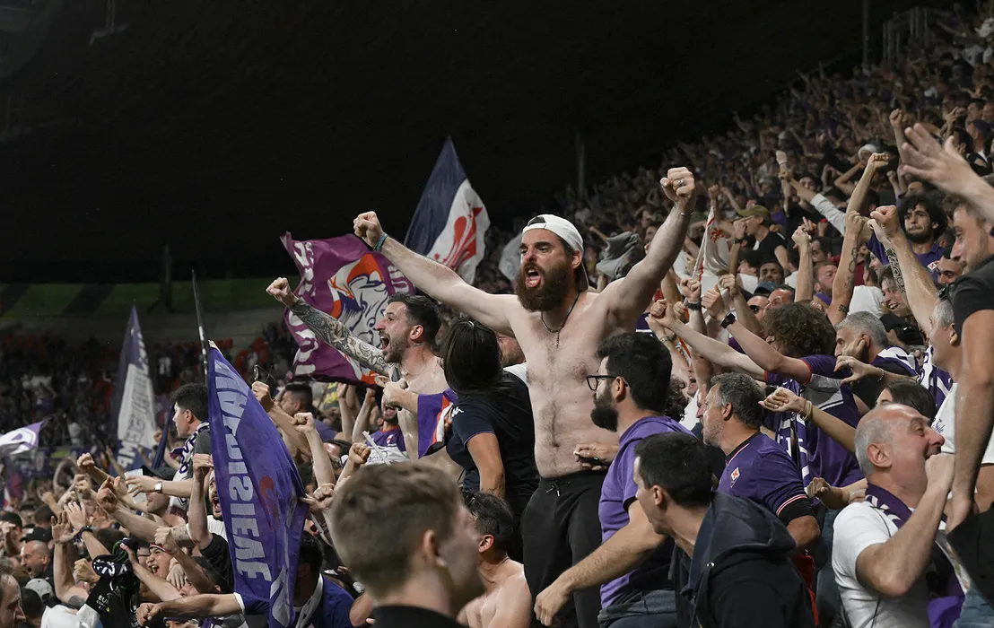 Fiorentina fans celebrate the 1-1 during the UEFA Europa Conference League 2022/23 final match between ACF Fiorentina and West Ham United FC in Prague, Czech Republic on June 7, 2023. (Photo by Michal CIZEK / AFP)