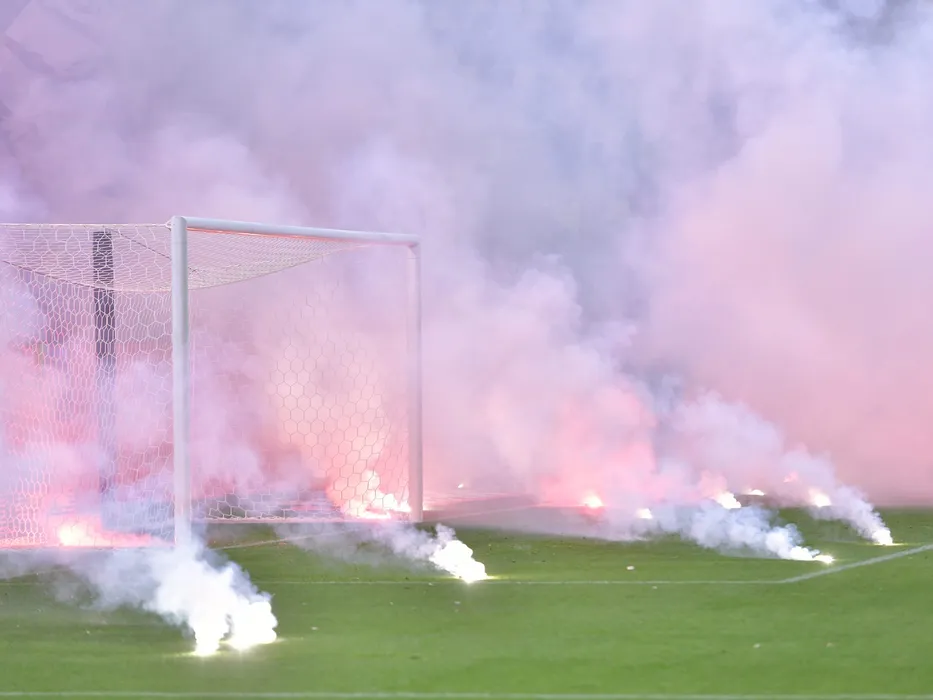 Fumigene pe teren la meciul de fotbal dintre FCSB si Rapid Bucuresti, contand pentru Liga 1 Casa Pariurilor, desfasurat pe Arena Nationala din Bucuresti, miercuri 15 decembrie 2021. © FOTO:Razvan Pasarica/SPORT PICTURES