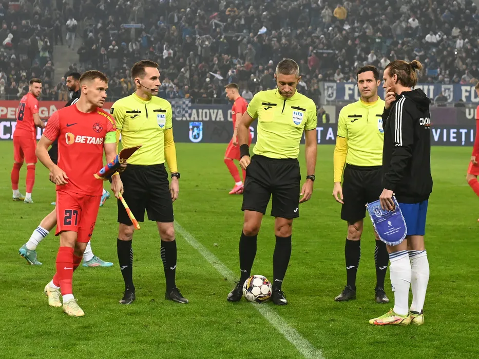 Brigada de arbitrii formata din Mircea Mihail Grigoriu, Radu Petrescu si Mihai Marius Marica alaturi de capitanii Darius Dumitru Olaru si Jeremy Huyghebaert in meciul de fotbal dintre FC U Craiova si FCSB, contand pentru Superliga Superbet, desfasurat pe Stadionul Ion Oblemenco din Craiova, duminica 13 noiembrie 2022. © FOTO:Razvan Pasarica/SPORT PICTURES