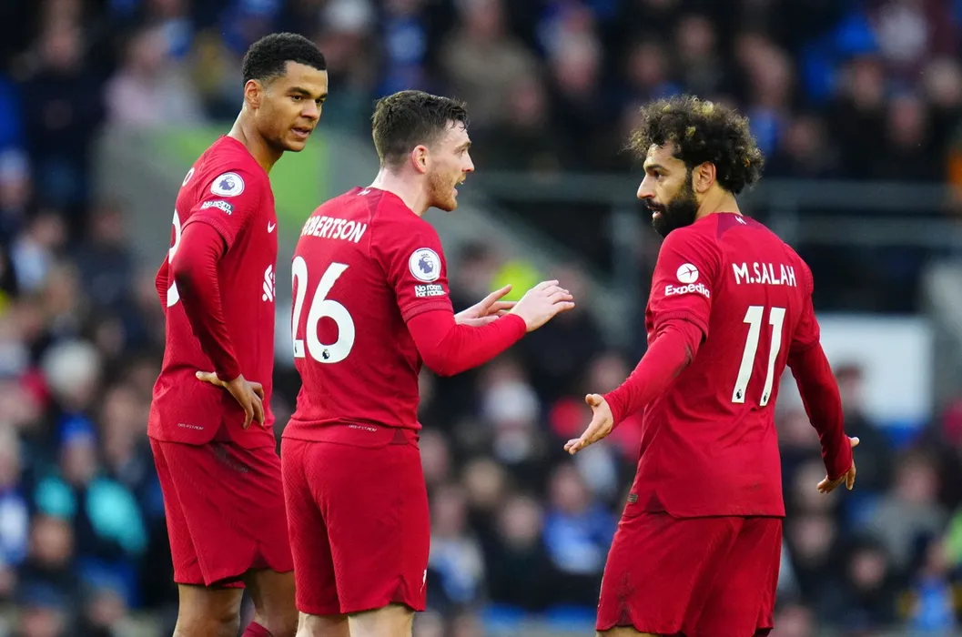 Andrew Robertson of Liverpool issues instructions to Mohamed Salah and Cody Gakpo
