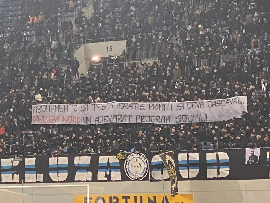 Suporterii olteni s-au războit în bannere la meciul dintre Universitatea Craiova și FC U Craiova: „Familia Mititelu vă plătește să-i cântați!” / „Peluza Nord: un adevărat program social!” | FOTO