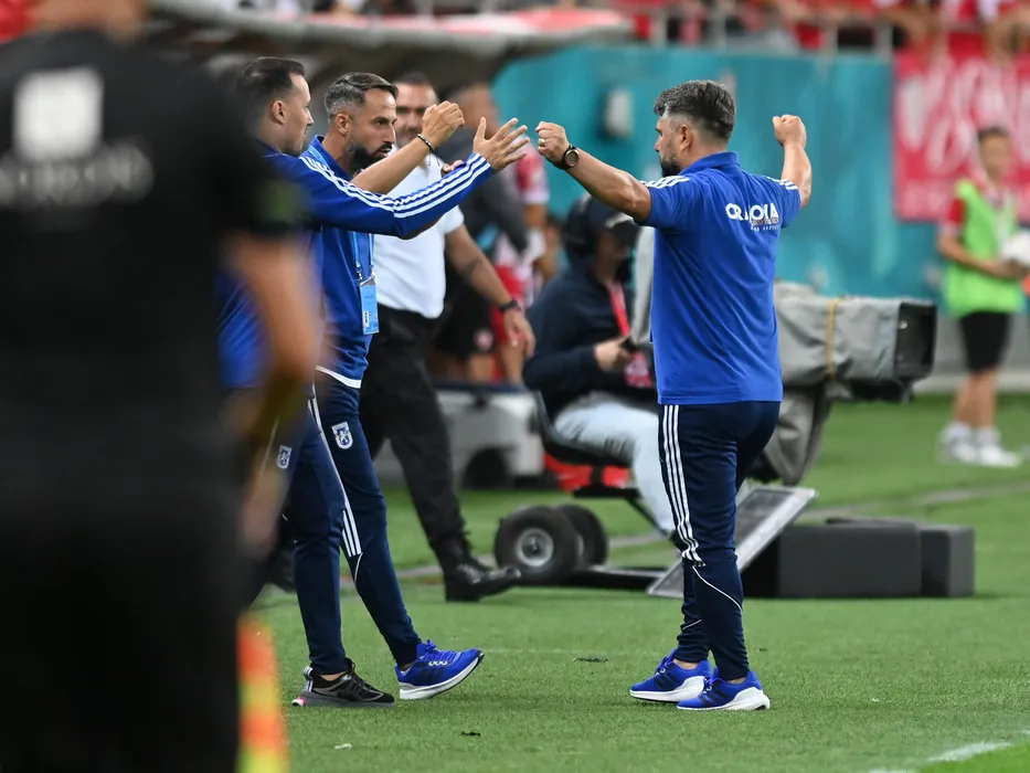 Florin Anton Dragan se bucura alaturi de Eduard Zelgin dupa meciul de fotbal dintre Dinamo Bucuresti si FC U Craiova, din cadrul Superligii Superbet, desfasurat pe Arena Nationala din Bucuresti, vineri 15 septembrie 2023. © FOTO:Razvan Pasarica/SPORT PICTURES