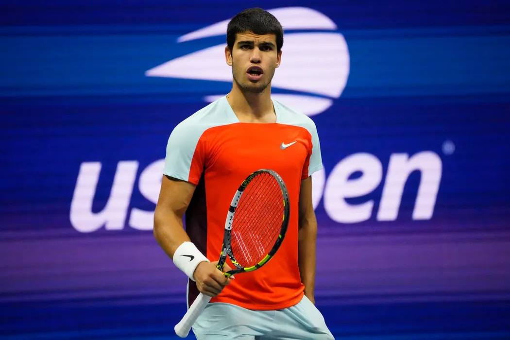 Sep 9, 2022; Flushing, NY, USA; Carlos Alcaraz (ESP) tea its after winning a point against Frances Tiafoe (USA) (not pictured) in a men's singles semifinal on day twelve of the 2022 U.S. Open tennis tournament at USTA Billie Jean King Tennis Center.,Image: 721565234, License: Rights-managed, Restrictions: *** World Rights ***, Model Release: no
