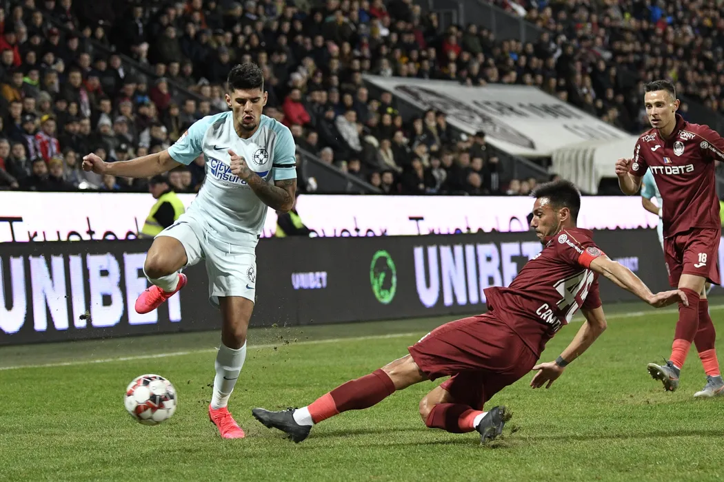 Camora (D), de la CFR Cluj, lupta pentru balon cu Florinel Coman (S), de la FCSB, in timpul meciului de fotbal din etapa a XXIII-a a Ligii 1, disputat pe stadionul Constantin Radulescu din Cluj-Napoca, duminica, 2 februarie 2020. FLAVIU BUBOI/ MEDIAFAX FOTO