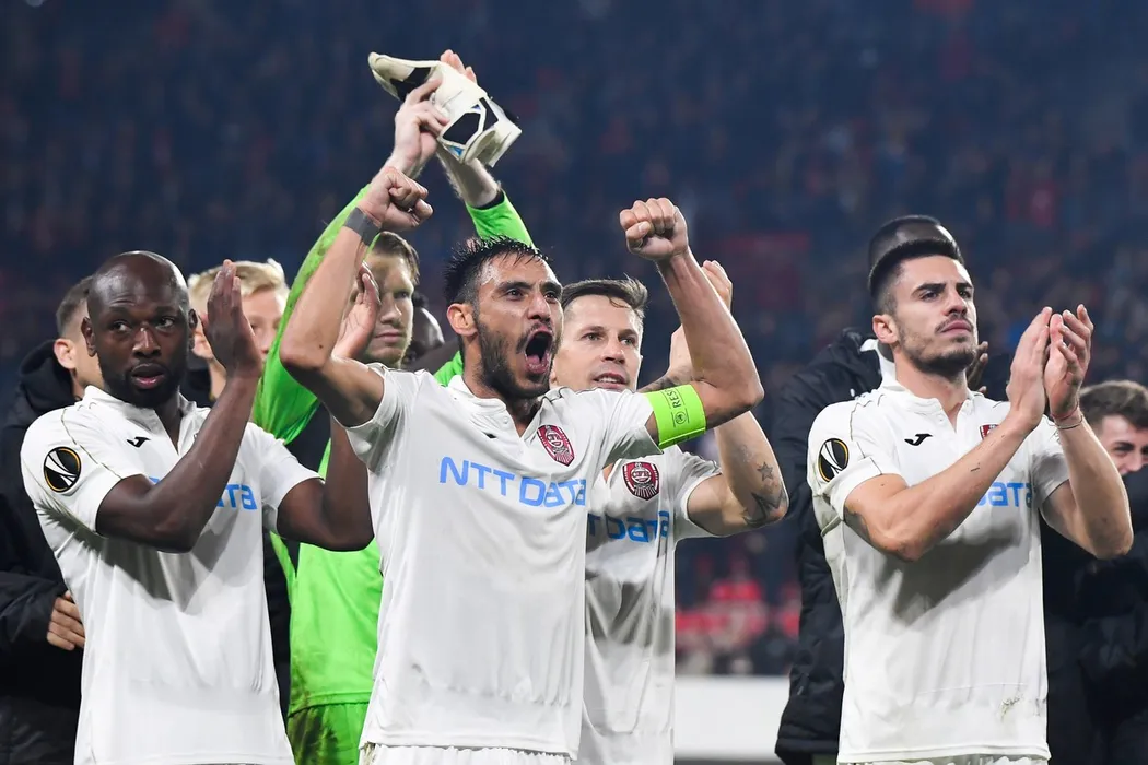 Cluj's Portuguese defender Camora (C) celebrates with teammates after winning the Europa League Group E football match between Rennes and CFR Cluj at the Roazhon Park stadium in Rennes, on October 24, 2019., Image: 478811288, License: Rights-managed, Restrictions: , Model Release: no, Credit line: DAMIEN MEYER / AFP / Profimedia