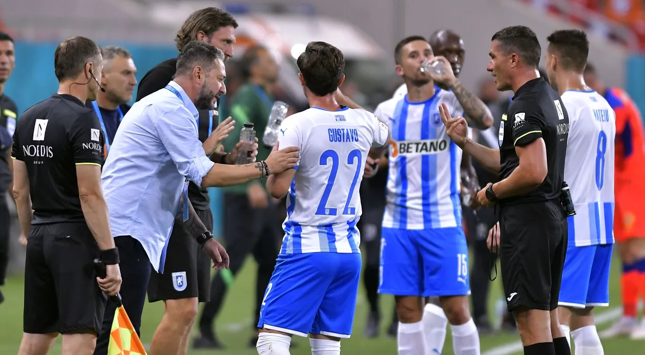 Dragos Sebastian Bon alaturi de fotbalistii craioveni si arbitrul central Istvan Kovacs la o pauza de hidratare in meciul de fotbal dintre FCSB si Universitatea Craiova, contand pentru Liga 1 Casa Pariurilor, desfasurat pe Arena Nationala din Bucuresti, duminica 25 iulie 2021. © FOTO:Razvan Pasarica/SPORT PICTURES