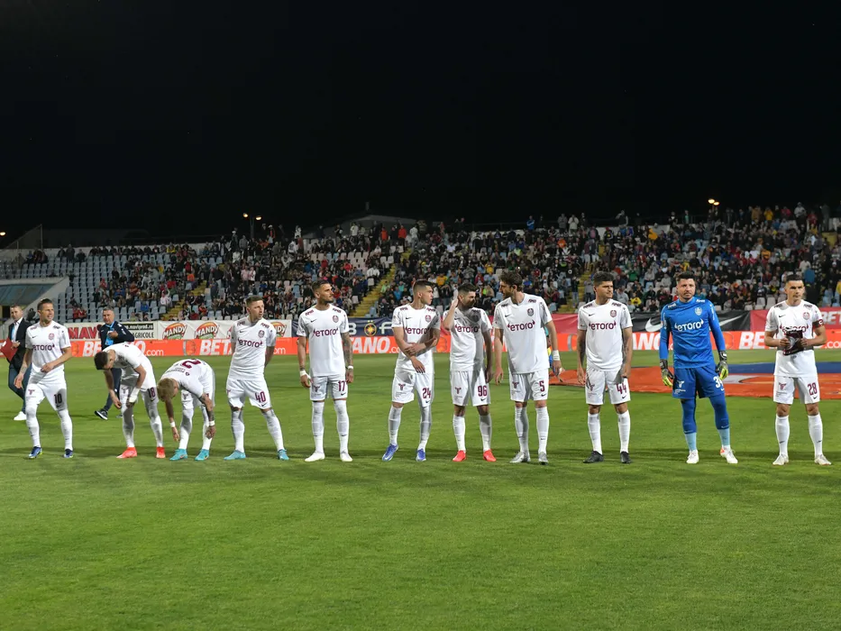 Fotbalistii clujeni la startul meciului de fotbal dintre FCSB si CFR Cluj, contand pentru Play-off-ul Ligii 1 Casa Pariurilor, desfasurat pe Stadionul Gloria din Buzau, duminica 22 mai 2022. © FOTO:Razvan Pasarica/SPORT PICTURES