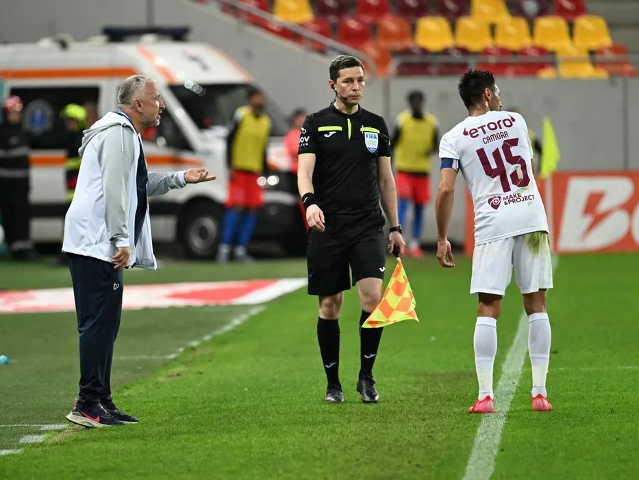 Dan Vasile Petrescu discută cu Mario Camora (Malico Paulino Mario Jorge) sub privirile arbitrului asistent Ferencz Tunyogi la meciul de fotbal dintre FCSB si CFR Cluj, din cadrul Play off-ului Superligii Superbet, desfasurat pe Arena Nationala din Bucuresti, duminica 20 aprilie 2025. © FOTO:Razvan Pasarica/SPORT PICTURES