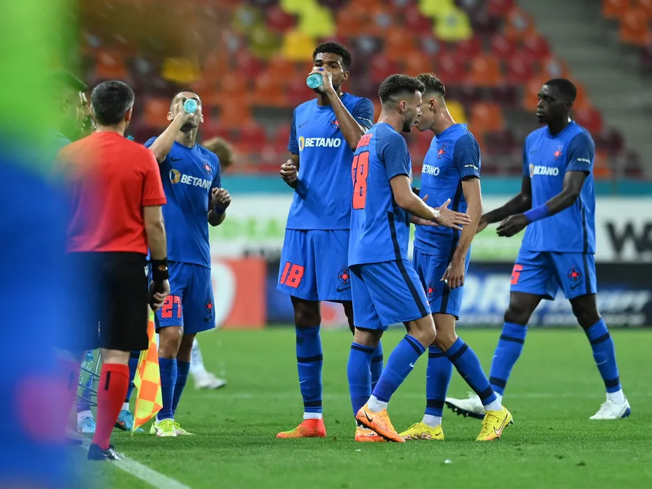 Fotbalistii stelisti Sylas Laouari Edjouma Malcom, Andrei Ioan Cordea si Joyskim Aurelien Dawa Tchakonte la o pauza de hidratare avuta in meciul de fotbal dintre FCSB si FK Viking Stavanger, din cadrul play-off-ului UEFA Europa Conference League, desfasurat pe Arena Nationala din Bucuresti, joi 18 august 2022. Bucuresti *** Star footballers Sylas Laouari Edjouma Malcom, Andrei Ioan Cordea and Joyskim Aurelien Dawa Tchakonte during a hydration break during the football match between FCSB and FK Viking Stavanger, in the play off of the UEFA Europa Conference League, held at the National Arena in Bucharest, on Thursday August 18, 2022 Bucharest Copyright: xRazvanxPasarica/SPORTxPICTURESx,Image: 715059002, License: Rights-managed, Restrictions: Credit images as "Profimedia/ IMAGO", Model Release: no