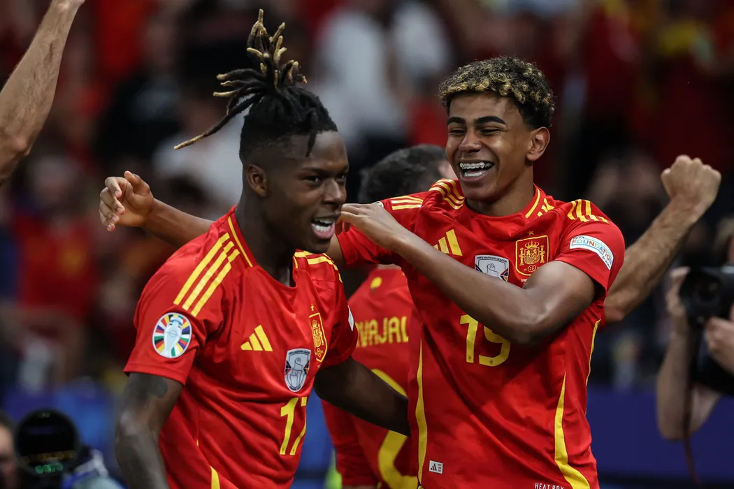 Nico Williams (L) of Spain celebrates scoring with teammate Lamine Yamal during the UEFA Euro 2024 final match between England and Spain in Berlin, Germany, July 14, 2024. Photo by Pan Yulong/Xinhua/ABACAPRESS.COM