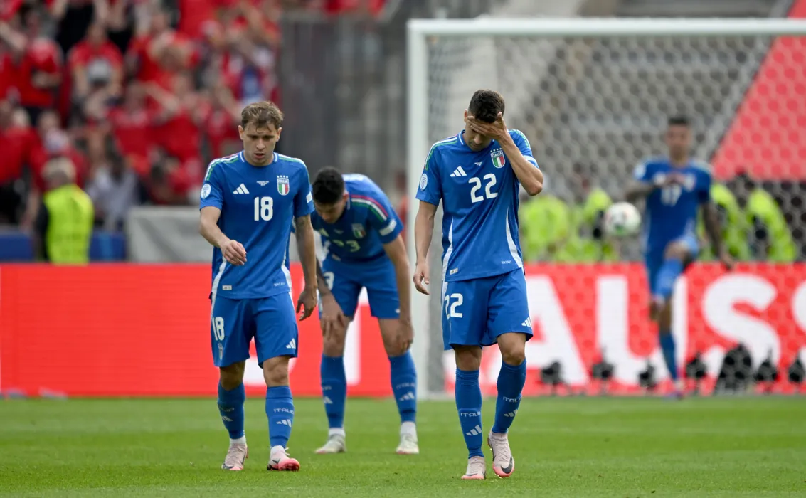 29 June 2024, Berlin: Italy's Nicolò Barella (L) and Stephan El Shaarawy react after Switzerland's first goal during the UEFA Euro 2024 round of 16 soccer match between Switzerland and Italy at Olympiastadion Berlin. Photo: Robert Michael/dpa