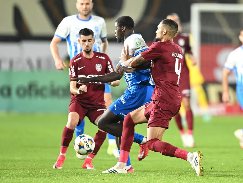 Steven Nsasa Nsimba Labe Aime si Meriton Korenica, Leonardo Da Costa Bolgado in meciul de fotbal dintre FC CFR 1907 Cluj si Universitatea Craiova, contand pentru Superliga Superbet, desfasurat pe Stadionul Dr.Constantin Radulescu din Cluj-Napoca, duminica 3 august 2025. © FOTO:Flaviu Buboi/SPORT PICTURES