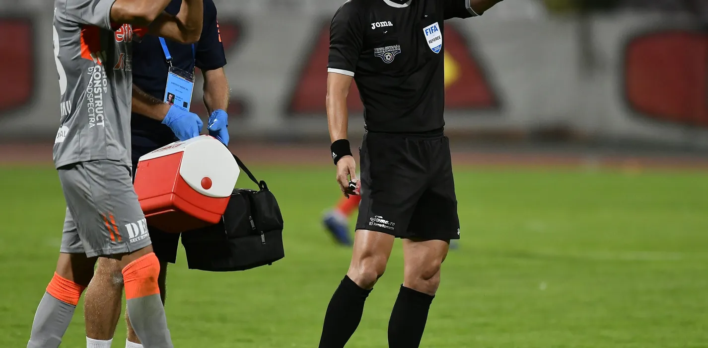Valentin Buhacianu alaturi de arbitrul central Sebastian Coltescu in meciul de fotbal dintre Dinamo Bucuresti si UTA Arad, contand pentru Liga 1 Casa Pariurilor, desfasurat fara spectatori pe Stadionul Dinamo din Bucuresti, luni 28 septembrie 2020. © FOTO:Razvan Pasarica/SPORT PICTURES