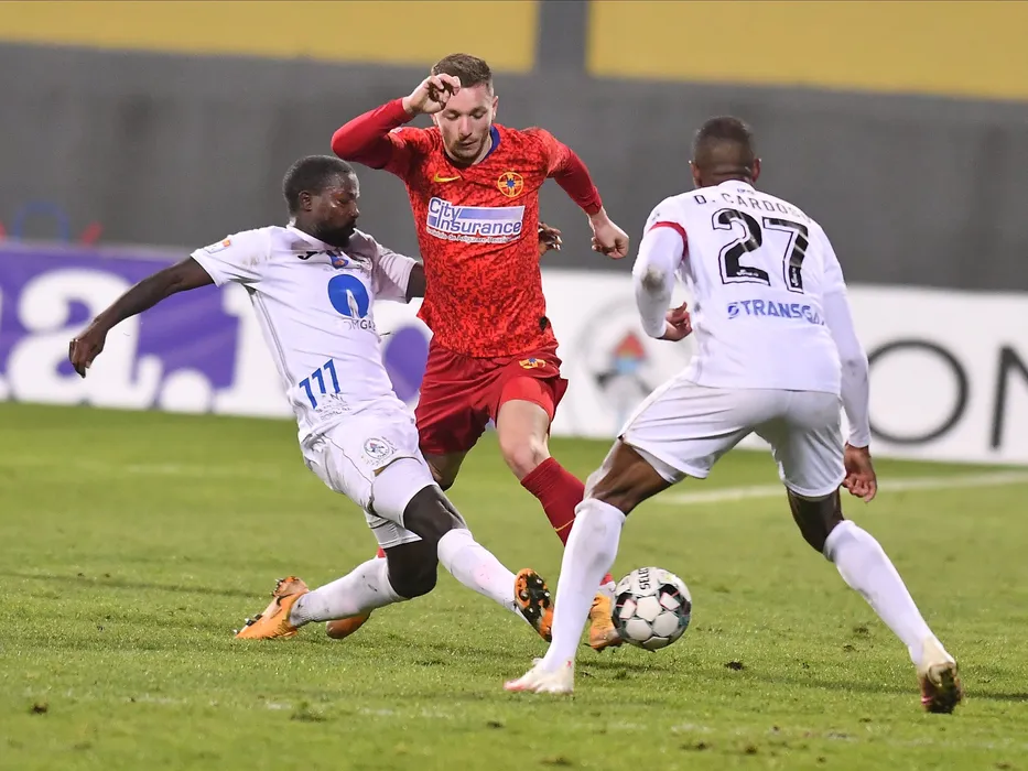 Bryan Alceus si Ionut Constantin Pantiru in meciul de fotbal dintre Gaz Metan Medias si FCSB, contand pentru Liga 1 Casa Pariurilor, desfasurat fara spectatori pe Stadionul Municipal din Medias, luni 23 noiembrie 2020. © FOTO:Razvan Pasarica/SPORT PICTURES