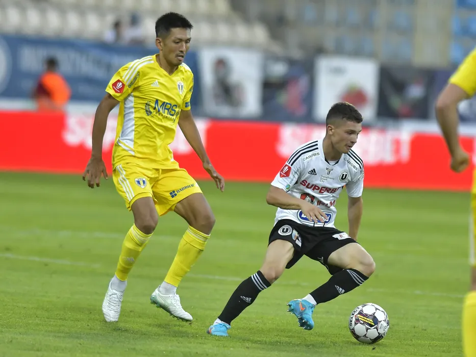 Seto Takayuki si Florian Nichita Haita in meciul de fotbal dintre Universitatea Cluj si Petrolul Ploiesti, contand pentru Superliga Superbet, desfasurat pe stadionul Municipal din Medias, vineri 5 august 2022. © FOTO:Razvan Pasarica/SPORT PICTURES