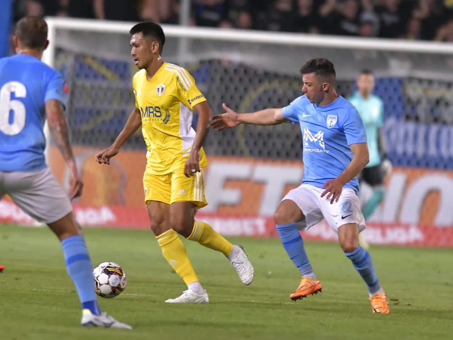 Seto Takayuki si Cristian Ionut Costin in meciul de fotbal dintre Petrolul Ploiesti si FC Voluntari, contand pentru Superliga Superbet, desfasurat pe Stadionul Ilie Oana din Ploiesti, luni 18 iulie 2022. © FOTO:Razvan Pasarica/SPORT PICTURES