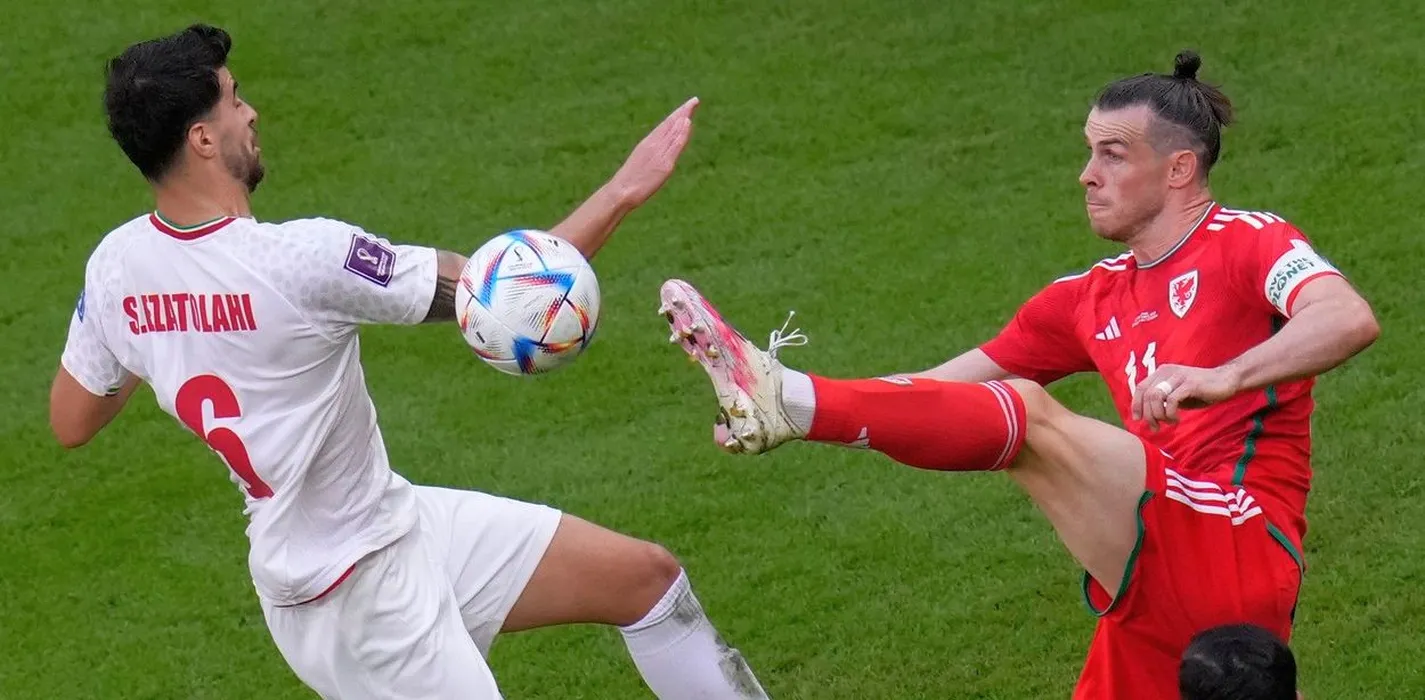 Wales' Gareth Bale, right, duels for the ball with Iran's Saeid Ezatolahi during the World Cup group B soccer match between Wales and Iran, at the Ahmad Bin Ali Stadium in Al Rayyan , Qatar, Friday, Nov. 25, 2022.,Image: 740114118, License: Rights-managed, Restrictions: This content is intended for editorial use only. For other uses, additional clearances may be required., Model Release: no