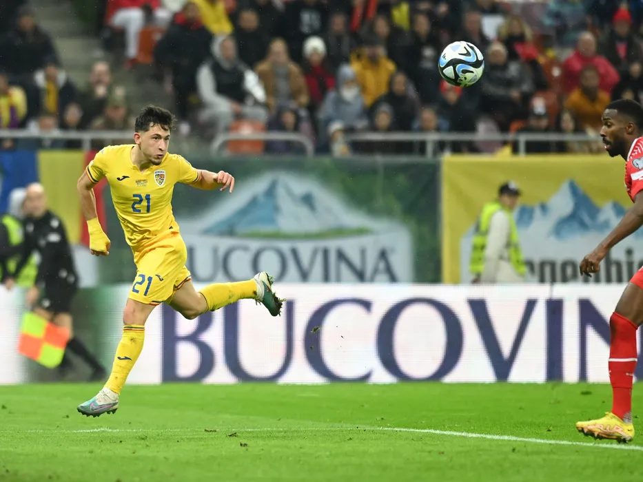 Olimpiu Morutan centreaza la golul lui Denis Alibec marcat in meciul de fotbal dintre Romania si Elvetia, din cadrul preliminariilor Campionatului European 2024, desfasurat pe Arena Nationala, marti 21 noiembrie 2023. © FOTO:Razvan Pasarica/SPORT PICTURES